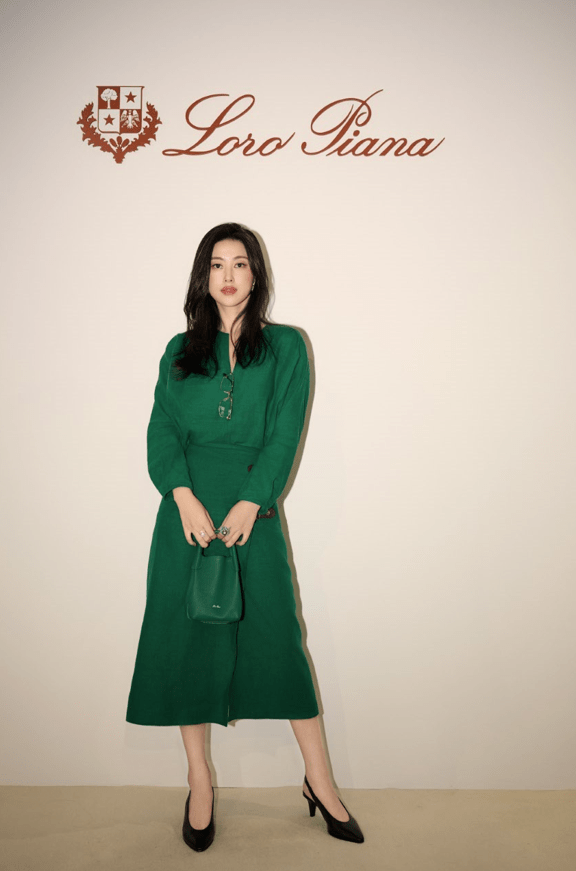 演员朱珠身着Loro Piana 2023秋冬系列森林叶绿衬衫、半身裙,搭配同色Bale迷你手袋及黑色高跟鞋,松弛优雅,展露悠然韵调。