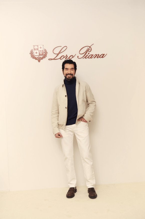 演员费翔身着Loro Piana 2023秋冬系列米白色飞行员夹克、海军蓝高领针织衫、白色五口袋长裤,搭配深棕色莫卡辛皮鞋,儒雅从容,诠释绅士优雅